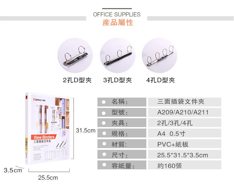 COMIX A235 PVC可插封面文件夾 A4 2寸50mm3孔D型夾